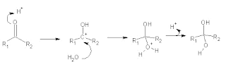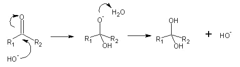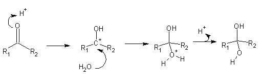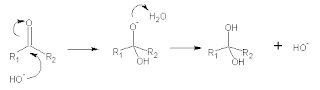A hidratação de aldeídos pode ser feita através de vias ácidas ou básicas, sendo o produto final um diol (molécula de álcool com dois grupos hidroxila):